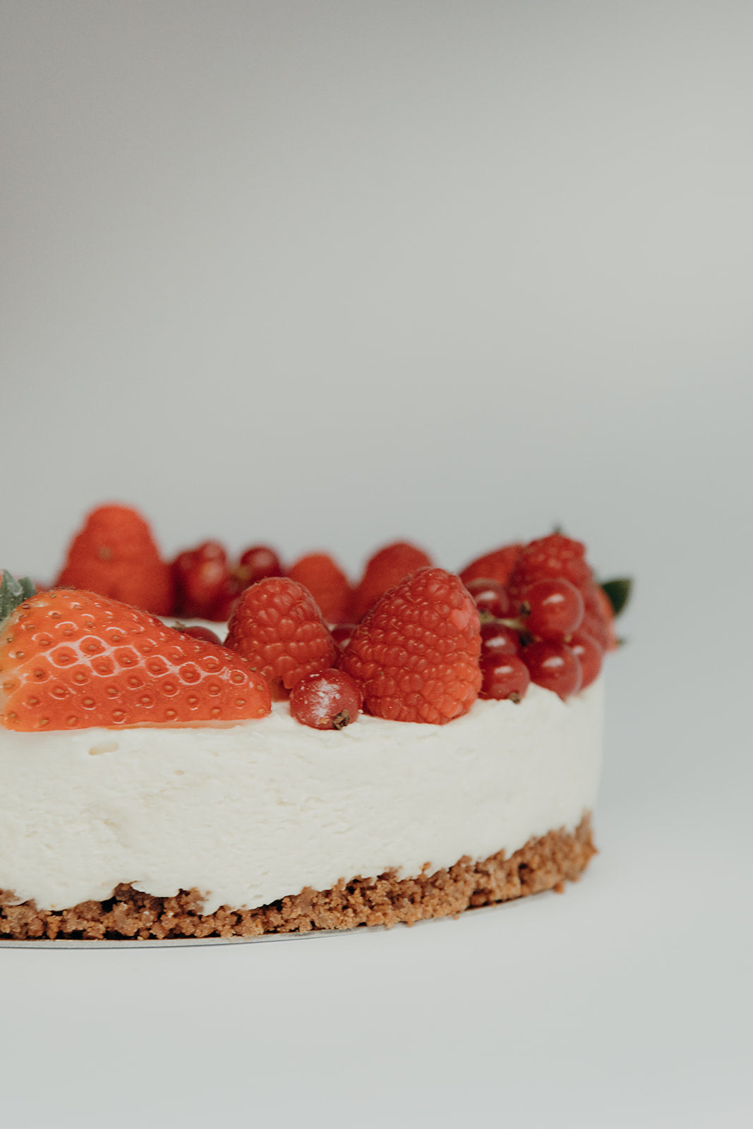 Geniet van deze zalige cheesecake met witte chocolade & speculoos, versierd met rode vruchten en schattige kerstfiguurtjes!